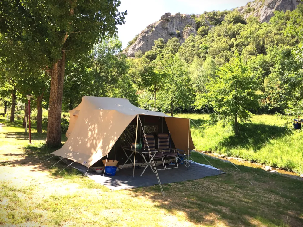 Pitch next to river with electric 2 people and a dog. Good wifi from the pitch. Level and quiet site.