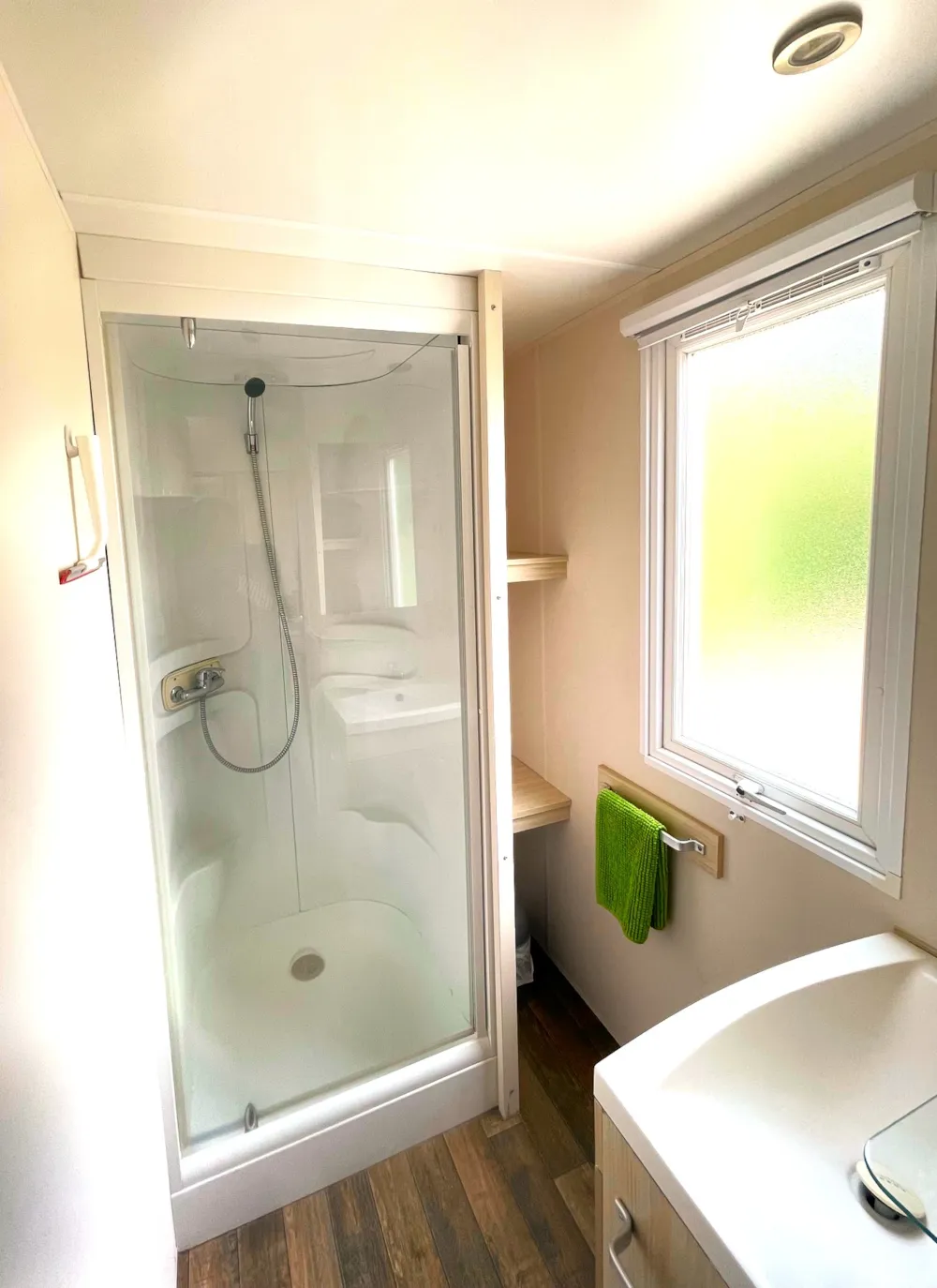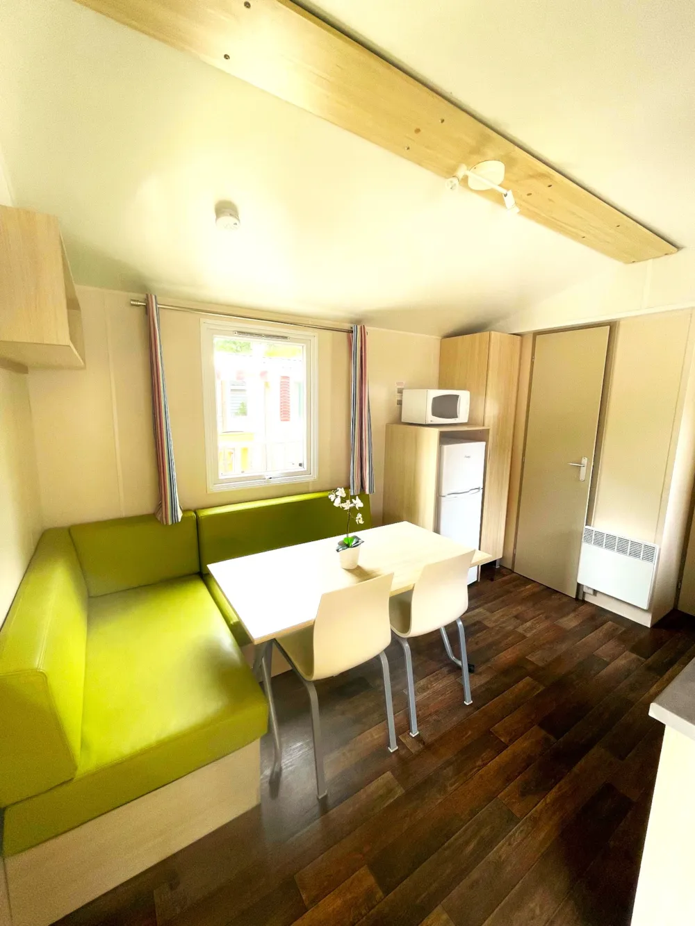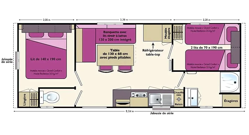 1 Schlafzimmer mit 2 Einzelbetten (70 x 190 cm) + Option bei 4 Mobilheimen: 1 Querbett (70 x 160 cm)