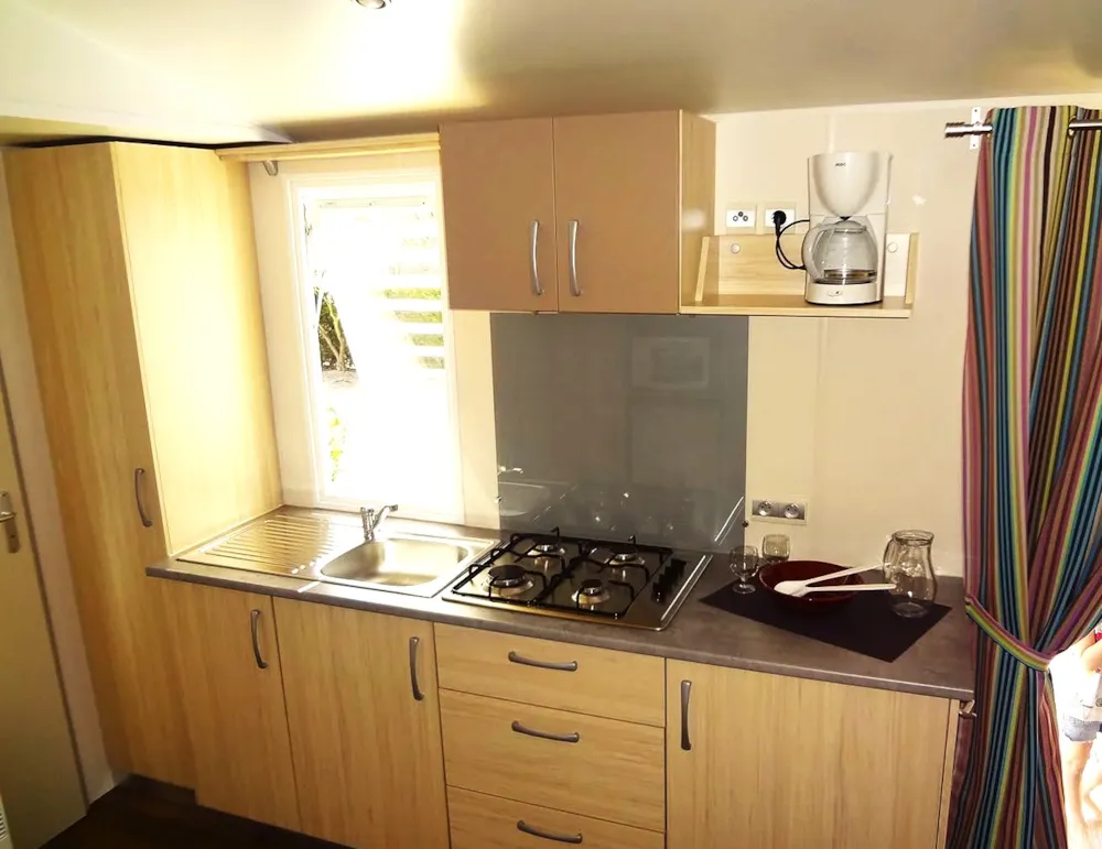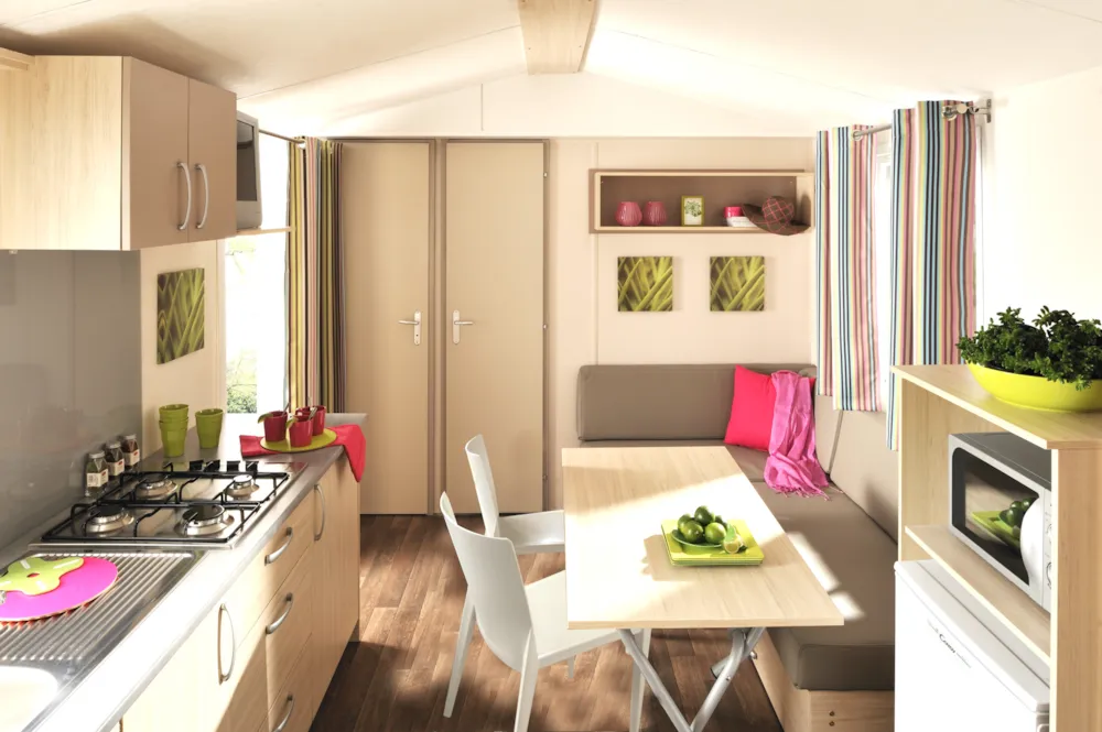 Mobilheim Farniente, 35 m² (8 m x 3 m + 2,5 m x 4,5 m Terrasse), bestehend aus: