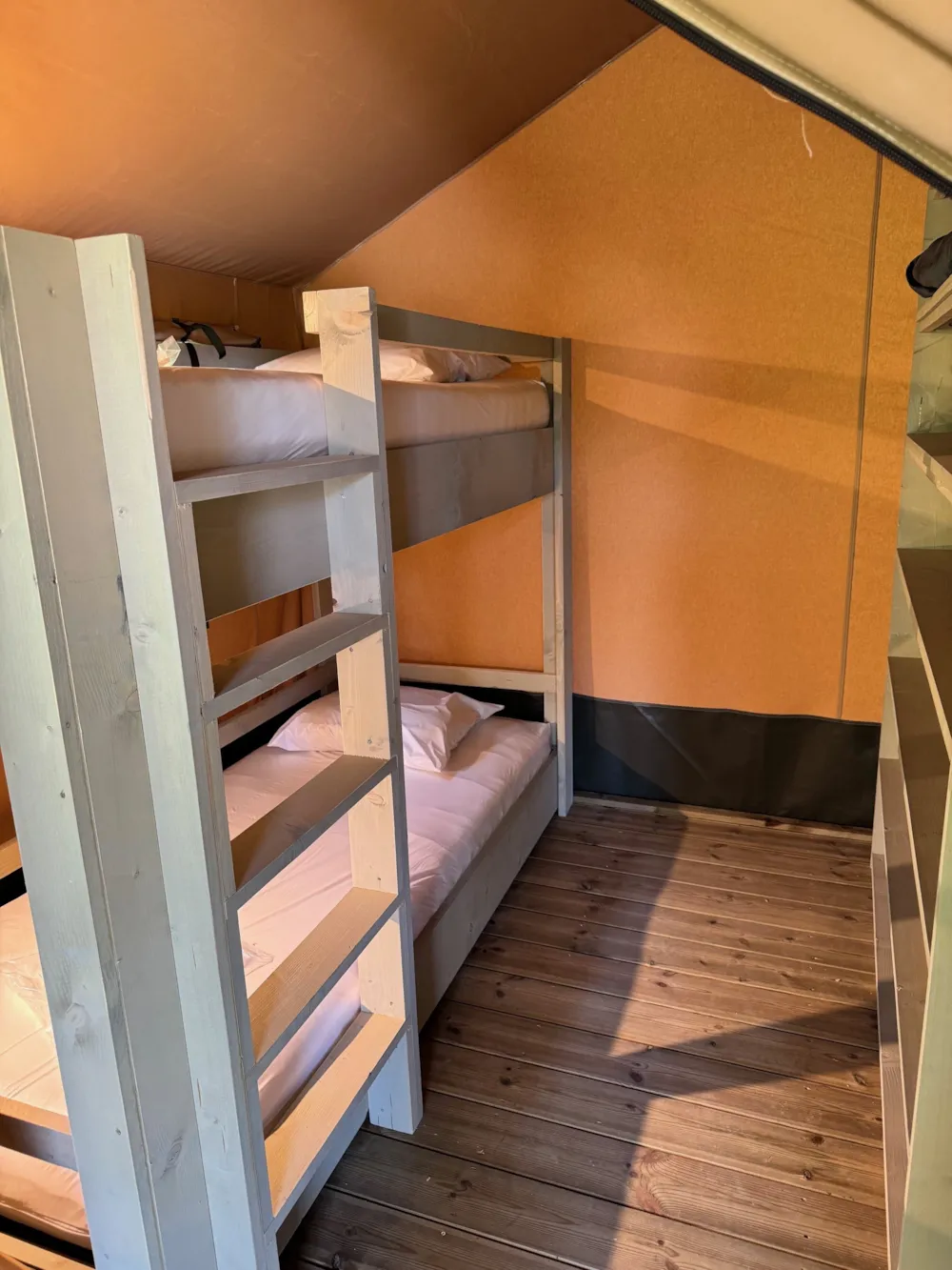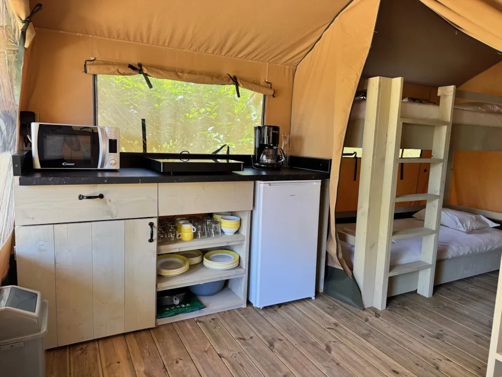 Nieuwe, praktisch ingerichte Lodge tent. Voldoende (buiten)ruimte met mooi vlonderterras.