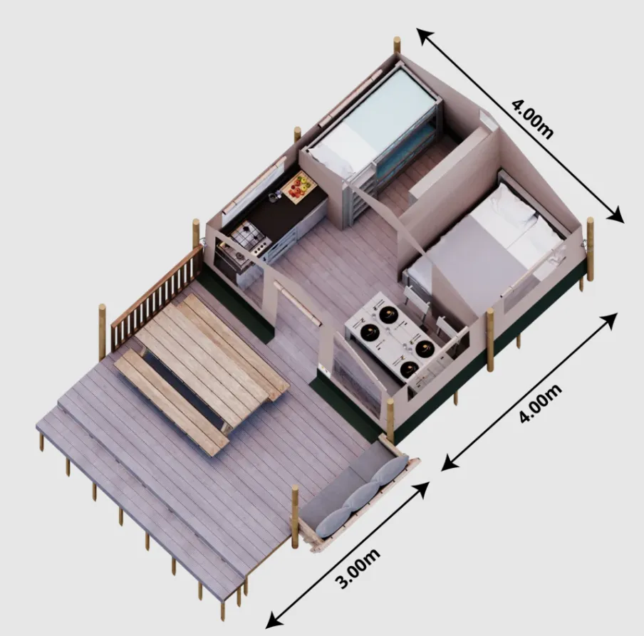 Keukeninventaris had iets uitgebreider gemogen. Matrassen van het tweepersoonsbed lagen soms op het bedframe ipv erin waardoor de matrassen soms naar het midden schuin afliepen.